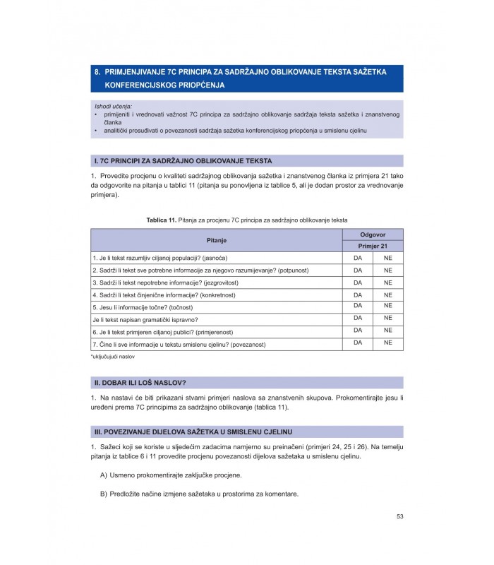 ...Priručnik je sadržajno i metodološki odlično osmišljen s ciljem stjecanja kompetencija odnosno temeljnih znanja potrebnih za analitičko razmišljanje o znanstvenim djelima, s naglaskom na znanstvene članke i konferencijska priopćenja te temeljnih vještina pisanja sažetaka znanstvenog članka i konferencijskog priopćenja, kao i izrade izlaganja na posteru i usmenog izlaganja. Nastava temeljena na priručniku će se bazirati na metodama aktivnog učenja, uključujući problemski orijentiranu nastavu i projektno orijentiranu nastavu. Ovako osmišljen nastavni tekst omogućava studentima samostalan rad kao i rad u paru odnosno grupi i predstavlja izvrsnu osnovu za daljnji profesionalni razvoj i nakon završetka studija ...